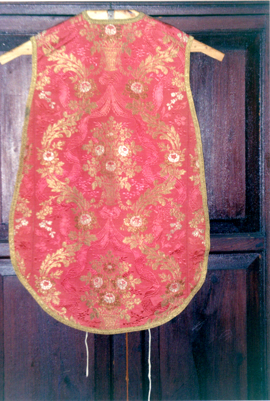 La pianeta, benché apparentemente simile a tutte le altre, ha caratteristiche che la rendono davvero particolare. Innanzitutto la sagoma estremamente attondata nella parte inferiore, quasi ad emiciclo e nessuna compartizione realizzata con galloni, ricami, o altre tecniche presenti invece, anche per ragioni teologiche (la questione trinitaria, il retaggio grafico della piega del "cappuccio" che innanzi all'Altissimo deve essere tolto etc.), in tutte o quasi le pianete. Circa il decoro del ricchissimo tessuto (lampasso broccato) questo si sviluppa con un doppio meandro fitomorfico simmetrico in oro con rose in argento su un fondo a damasco rosso fragola, ove si riconoscono motivi nastriformi e nodi d'amore. Al centro di ogni campo formato dalle doppie anse un canestro fiorito di rose. Ulteriori ornamenti, sempre di natura fitomorfica si dipartono, realizzati in filato e argento, dai meandri ed altri, tono su tono, arricchiscono il complicatissimo fondo damascato. Gallone perimetrale in filato d'oro tessuto a telaio.. Motivi decorativi a meandro fitomorfico/ rose/ canestro fiorito/ motivi nastriformi / nodo d‘amore