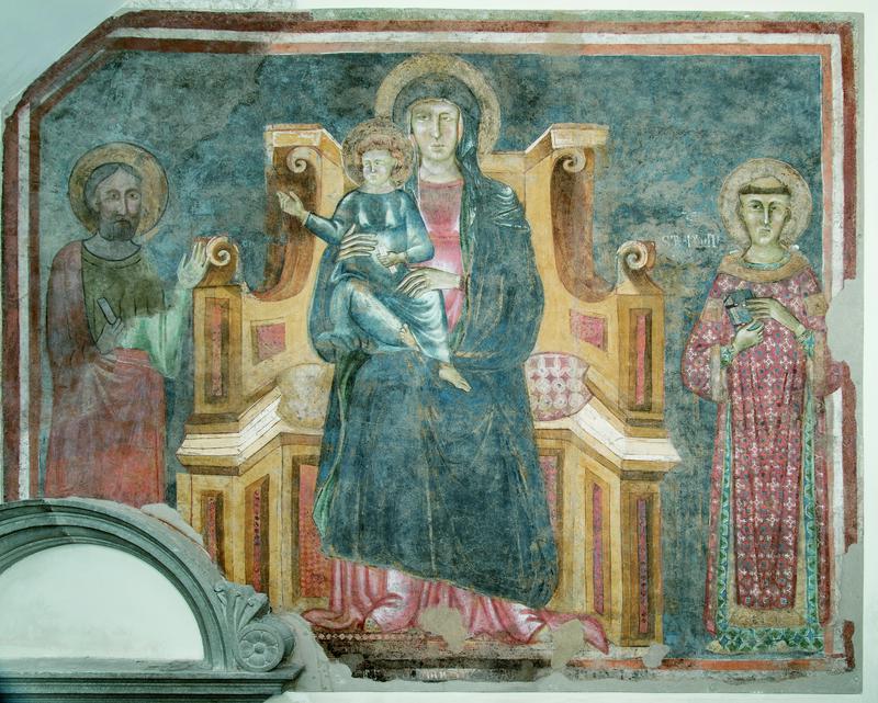 affresco staccato. Soggetto: sacro. Personaggi: Madonna; Bambino; San Giovanni Evangelista; Santo Stefano. Oggetti: trono