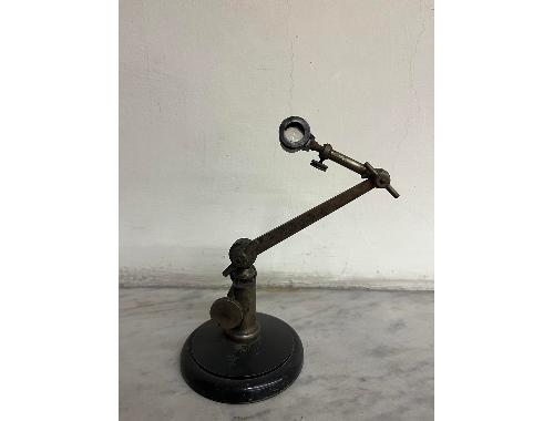 Microscopio tedesco con base metallica e colonna a cremagliera sulla quale c'è uno snodo con vite recante il braccio principale a sezione rettangolare e firmato lateralmente con l'incisione "Carl Zeiss Jena". All'estremità vi è secondo snodo con vite recante un secondo braccio con vite portante per secondo braccio portante la lente che può essere fissata nella posizione voluta mediante una vite.
