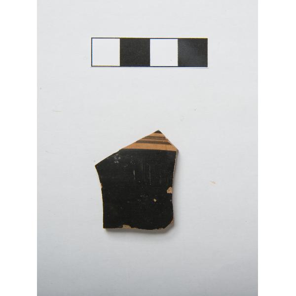 vasellame in ceramica, ceramica a figure nere, forma non identificabile chiusa . Frammento del corpo di un vaso a figure nere, forse di media grandezza, di forma non identificabile.Argilla di colore rosso chiaro; vernice nera lucente.All'esterno una fascia orizzontale risparmiata, parzialmente coperta da una pennellata in vernice nera diluita.Incrostazioni.