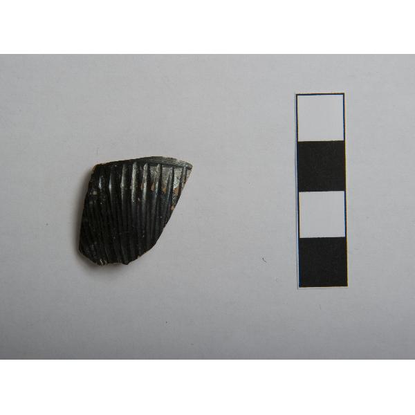 vasellame in ceramica, ceramica a vernice nera, forma non identificabile chiusa . Frammento di parete di un vaso media grandezza, forse usato per versare, di forma non identificabile, di ceramica apula di Tipo Gnathia, con in alto una solcatura orizzontale, in basso striature fitte verticali.Argilla rosa; all'esterno vernice nera lucente.