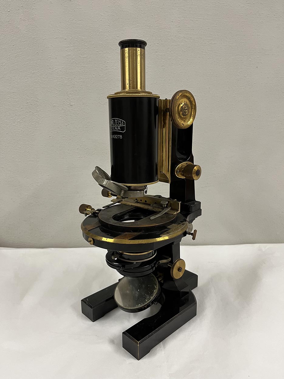 0.002m/m”. Il tavolino è rotondo (diam. 12,2 cm) e firmato “Carl Zeiss Jena”, è costituito da una parte centrale rialzata sulla quale scorre una barra che reca due mollette fermavetrini e un nonio di 6 cm per rilevarne la posizione. Le due mollette scorrono in un corridoio e quello di sinistra possiede un secondo nonio. Agendo su una vite laterale al tavolino (ora bloccata), la parte centrale rialzata trasla in senso orizzontale, lo spostamento è misurabile attraverso un terzo nonio di 40 cm indicato lungo il bordo. Il sistema di illuminazione è costituito da un condensatore (1,4 inciso sulla superficie e lungo il bordo) con due lenti convergenti, un diaframma a iride firmato sul bordo con “Carl Zeiss Jena” e munito di una scala da 0 a 10 per misurarne l’apertura. Il diaframma può subire uno spostamento laterale, essere rimosso del tubo agendo su una vite che si innesta su di una cremagliera orizzontale o traslare orizzontalmente collimando in modo preciso o parzialmente con l’apertura sottostante. L’altezza del sistema condensatore-diaframma è variabile tramite una vite che agisce su una cremagliera verticale. È presente uno specchio piano-concavo e un oculare che si inserisce in un cilindro avvitato al tubo porta ottica (filettatura 36G); quest’ ultimo è firmato “Carl Zeiss Jena” ed inciso con “K,4-5X”, (lungo 7 mm; diam. 23,2 mm; diam. di ingombro 28,4 mm). È presente un porta obiettivi a revolver quadruplo (Filettatura 36G); quest’ultimo è firmato “Carl Zeiss Jena” ed è inciso con “K. 4-5 X”. (lungo 7 mm; diam. 23,2 mm; diam. di ingombro 28,4 mm). È presente un porta obiettivi a revolver quadruplo (Filettatura 36G). Porta obiettivi, oculare, condensatore e mollette fermavetrini sono cromati
