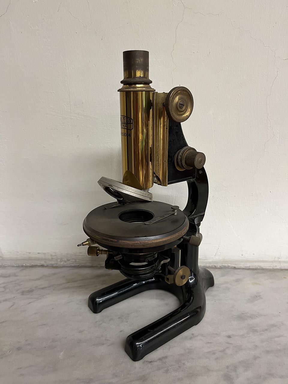 0.002 mm”. Il tavolino è rotondo con due viti di centramento e due mollette fermavetrini. Sotto il tavolino c’è il sistema di illuminazione costituito da: un porta condensatore (cilindro retto dal braccio e vite di centramento), qui manca il condensatore