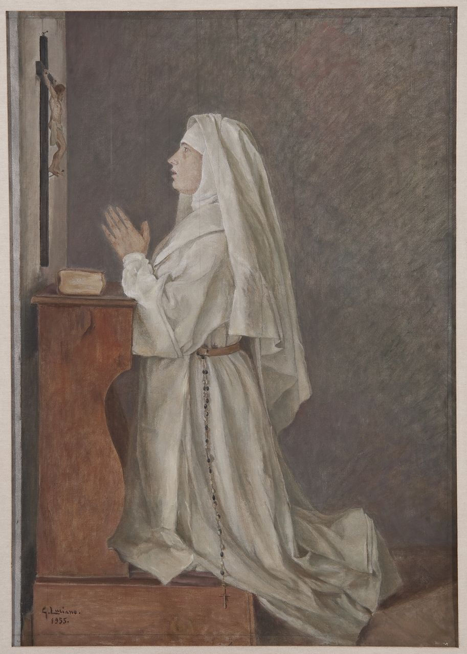 dipinto raffigurante una novizia inginocchiata mentre prega. Figure: monaca in preghiera. Oggetti: crocifisso