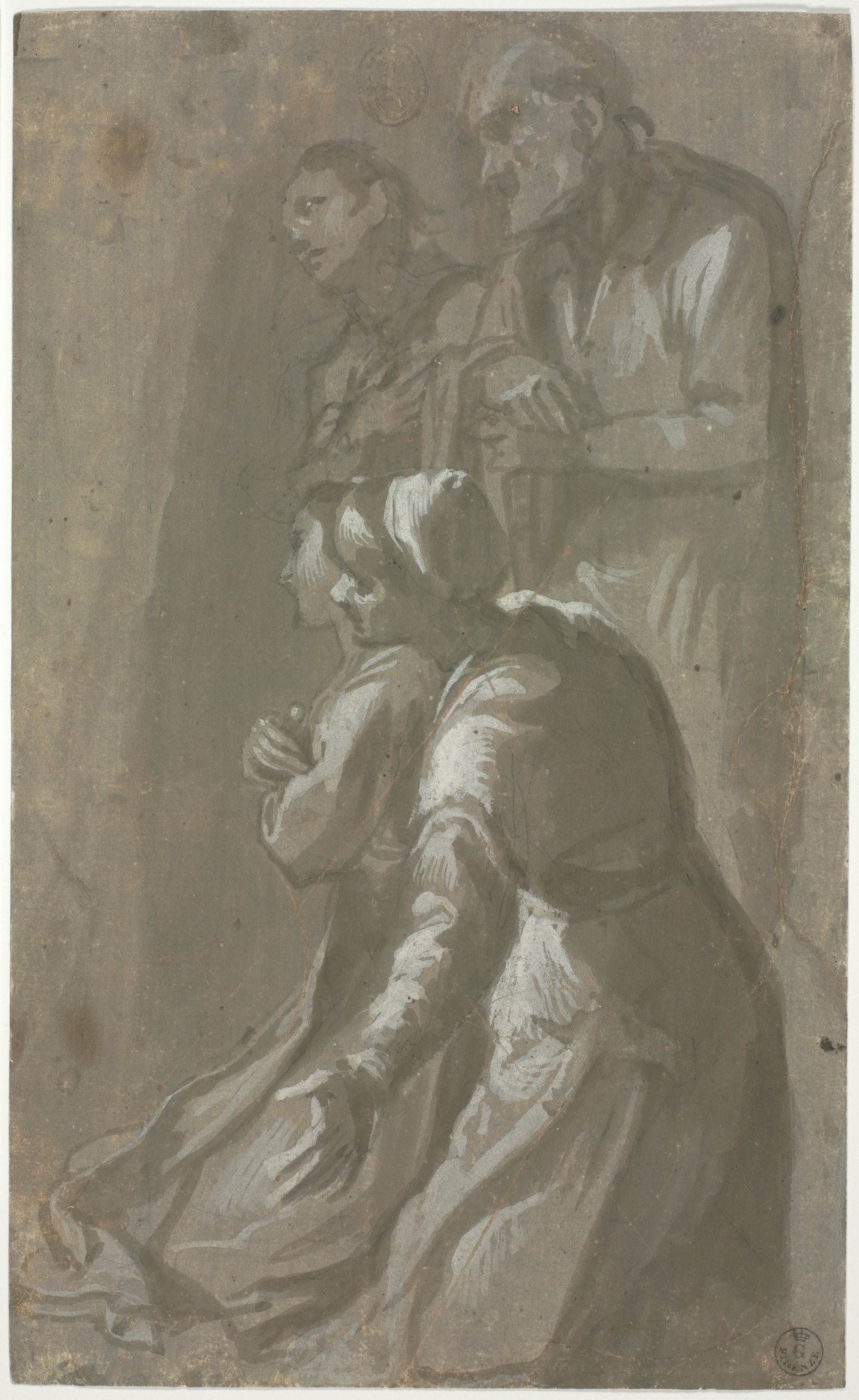 Studio di quattro figure, due femminili in ginocchio in primo piano, due maschili in piedi in secondo piano, in vari atteggiamenti di adorazione, tutte volte verso sinistra.. Figure: figure maschili; figure femminili