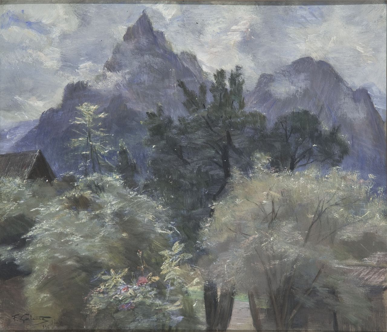 Siusi- Lo Sciliar, Paesaggio montano con alberi e baite (dipinto, opera isolata)