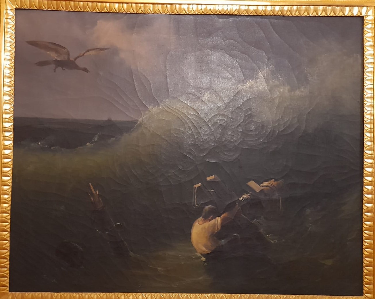 Dipinto rettangolare.. Soggetti profani. Mare. Figure: uomo. Mezzi di trasporto: nave. Animali: uccello