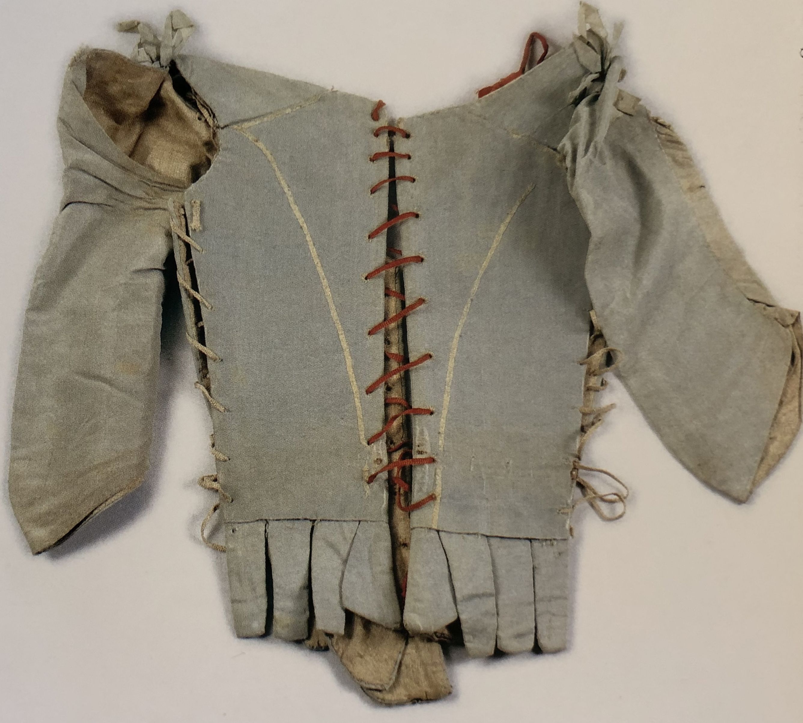 Corpino femminile realizzato in 4 pezzi separati in taffetas di seta celeste. Taglio in vita orizzontale con faldine, aperture al centro del lato anteriore e posteriore con fettuccia in seta color mattone e ai lati con fettuccia in seta bianca, passanti dentro occhielli (8 davanti, 10 dietro, 7 su ciascun lato); maniche sagomate a tre quarti, staccate e applicate con nastri in seta celeste. Le cuciture esterne sono rifinite da una treccina bianca. Fodera in tela di lino naturale, interfodera in tela rosa carico