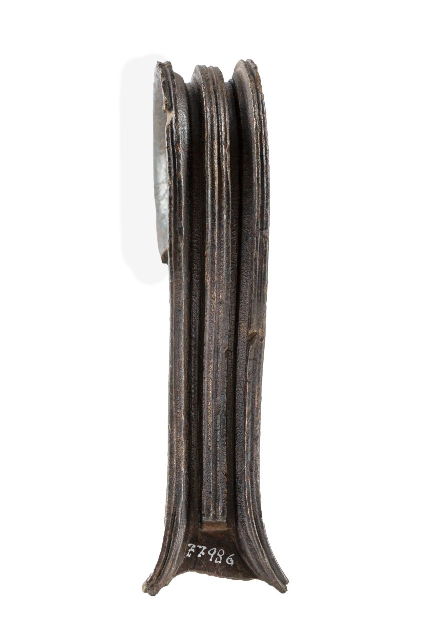 Ansa a nastro conformata a pastorale, con attacco inferiore originariamente nel punto di massima espansione del recipiente ed attacco superiore inchiodato al retro dell’imboccatura, immediatamente sotto l’orlo.. Il fusto dell’ansa presenta due profonde scanalature, nel senso della lunghezza, le quali separano i bordi da una fascia centrale, tutti ulteriormente percorsi da profonde incisioni verticali