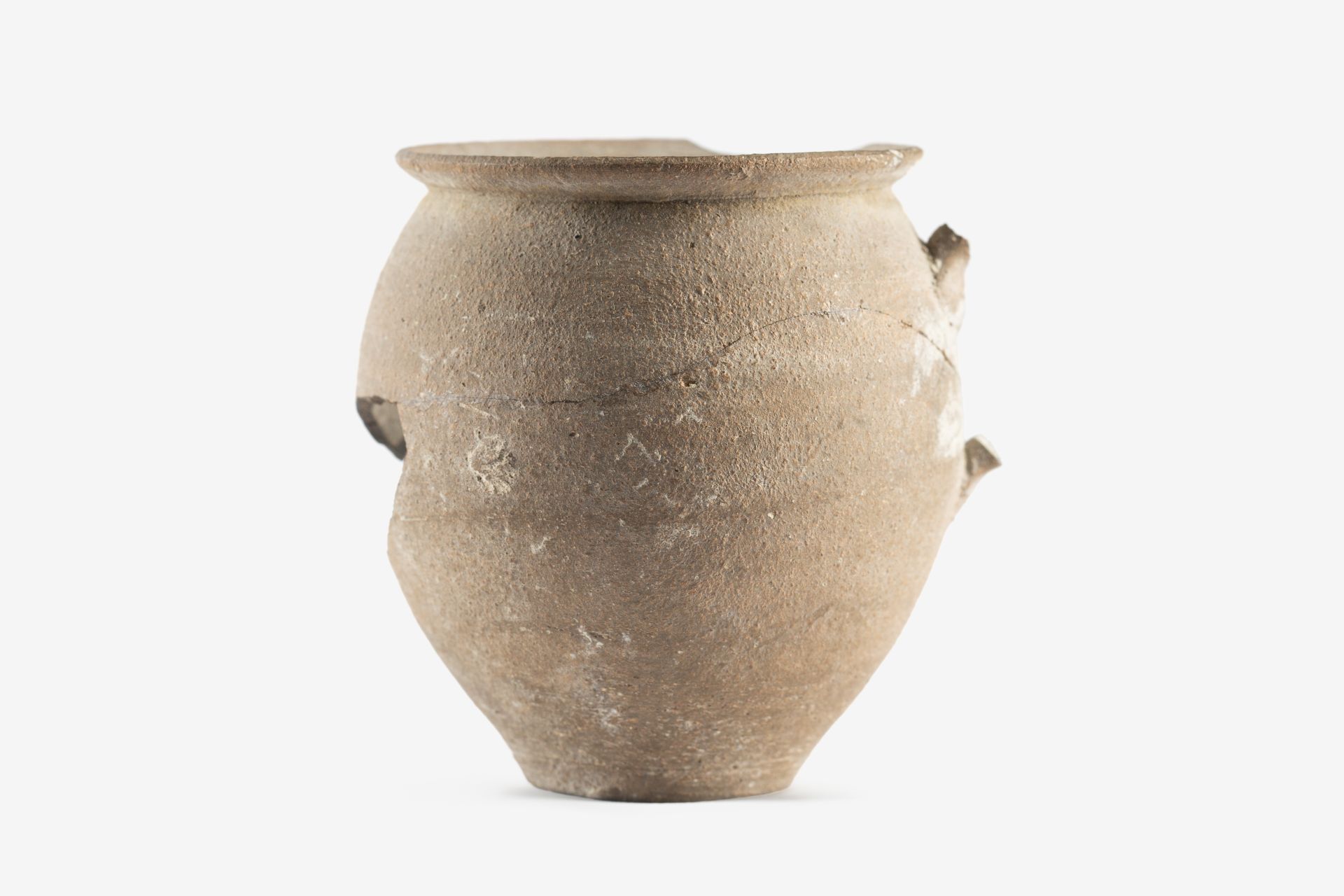 Boccalino monoansato in argilla semidepurata di colore bruno-rossiccio in frattura, bruno-arancio in superficie con numerosi inclusi neri; labbro svasato, che si assottiglia verso l’orlo, distinto, tramite una strozzatura, dal corpo ovoidale fortemente rastremato verso il basso dove termina in un fondo piano; ansa (perduta) con attacchi impostati sopra e sotto il punto di massima espansione del ventre.