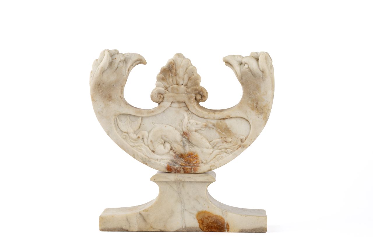 La lastra marmorea è configurata a pelta. I margini appaiono ben rifiniti da un bordo a rilievo a profilo arrotondato con margini zoomorfi ed apofisi centrale raffigurante una decorazione vegetale che delimita inferiormente lo spazio compreso entro i tre bracci della pelta, al centro del quale si legge una decorazione figurata, disposta su entrambi i lati. Sostegno definito da una larga base rettangolare sormontata da un pilastrino.. Le due estremità sono a forma di testa grifone e la punta centrale è decorata da una palmetta. Collocata alla sommita del corpo centrale del pezzo, è costantemente presente in questi oggetti, scolpita in posizione mediana fra le due protomi di grifo e cinta, nella parte inferiore, da un semplice listello orizzontale a rilievo, è inquadrata, ai due lati, da una coppia di piccole volute circolari che rappresentano la terminazione del bordo di contorno del campo figurato; elemento questo costituito da una fascia a rilievo piatto e liscio.Lato A: gorgoneion con larghe ciocche rese a serpentelli che formano una massa gonfia; il volto ha tratti regolari con occhi grandi e molto espressivi e mento arrotondato.Lato B: cavallo marino reso con corpo affusolato, dotato di un paio di grandi ali sul dorso, con il collo sormontato da una cresta o criniera più o meno pronunciata e con una lunga coda avvolta a spirale, terminante con una pinna caudale, bifida
