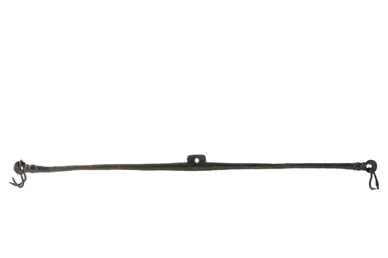 giogo costituito da un'asta orizzontale, a sezione rettangolare, con margini stondati, con punto di sospensione o asse di rotazione, posto esattamente al centro e caratterizzato da un perno di sospensione ad occhiello squadrato, in cui è inserito il gancio ad uncino per tenerla sospesa manualmente. Il giogo che tende a rastremarsi verso le estremità ha terminazioni ad occhiello funzionali all'appensione dei due piatti di carico attraverso ganci ad omega a cui sono agganciate tre o quattro lunghe catenelle (qui assenti) per l'appensione dei piatti di carico.