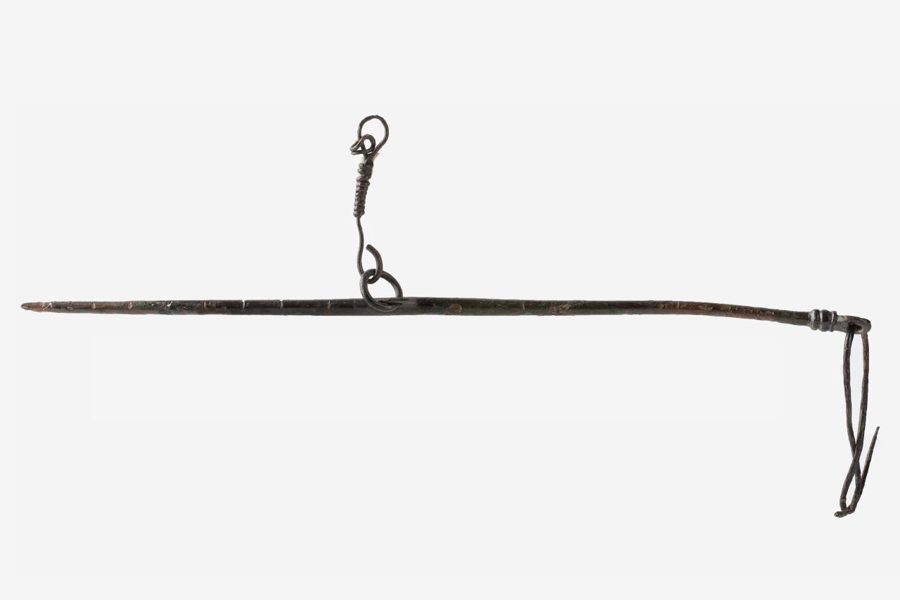 giogo costituito da un'asta orizzontale, a sezione circolare, con margini stondati, con punto di sospensione o asse di rotazione, posto esattamente al centro e caratterizzato da un perno di sospensione, ad anello, in cui è inserito il gancio per tenerla sospesa manualmente. Il giogo si rastrema verso le estremità e conserva solo una delle terminazioni ad occhiello funzionali all'appensione dei due piatti di carico. L'asta ha una scala graduata con tacche incise sulla parte superiore. Gancio ad omega nell'occhiello conservato (forse non pertinente).
