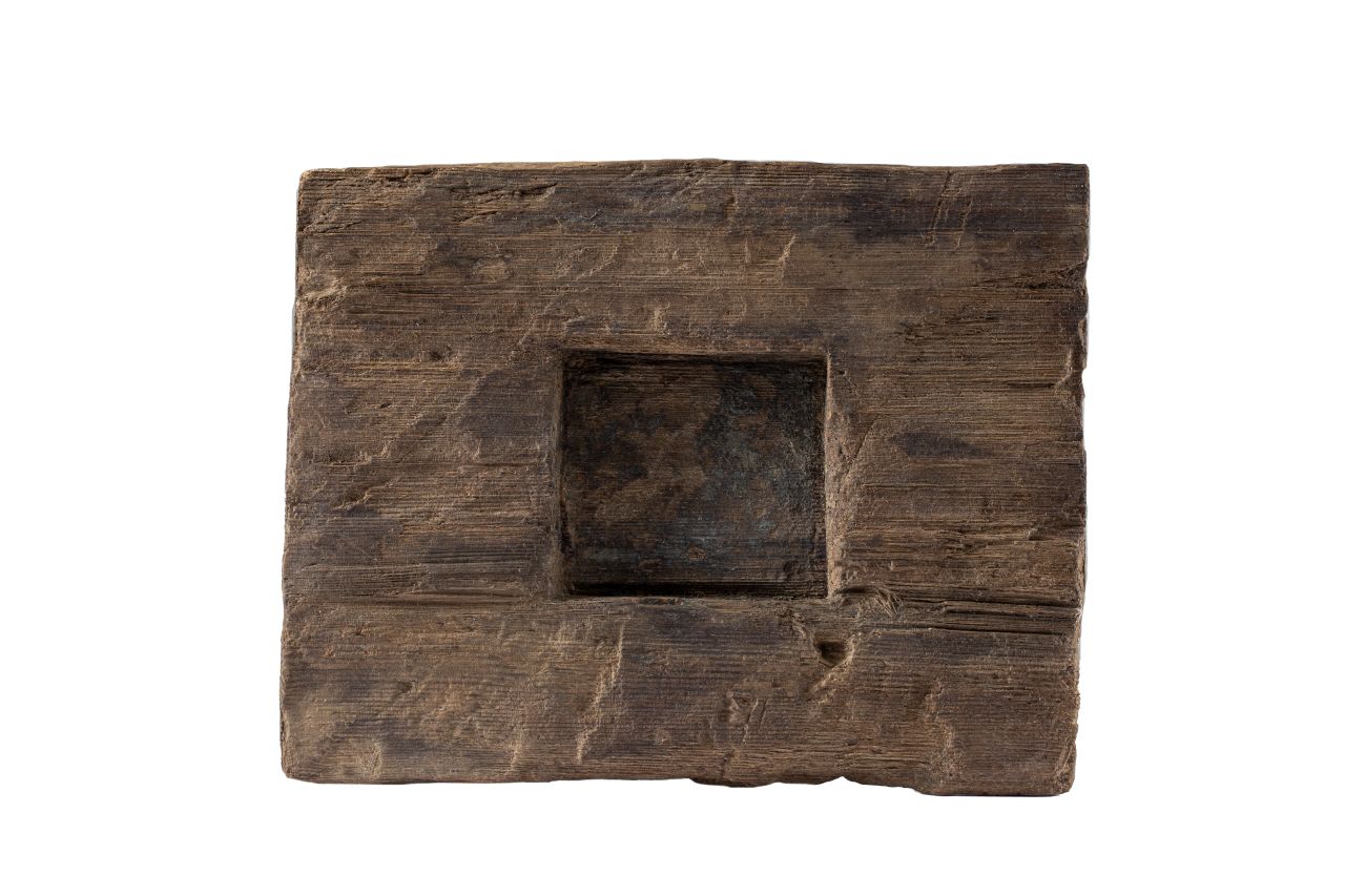 Pannello ligneo di forma grossomodo quadrata con incasso centrale con funzione decorativa. Lacunare del controsoffitto, in origine policromo. Il legno è lavorato con le tecniche di taglio, piallatura, scalpellatura, levigatura.. Sulla faccia principale si notano tracce evanite ed opache di colore blu su strato nero, sia sul fondo che sui bordi dell’incasso. Lo strato nero potrebbe essere un protettivo alterato o un colore coprente, applicato come base uniforme per i colori che venivano poi applicati sopra