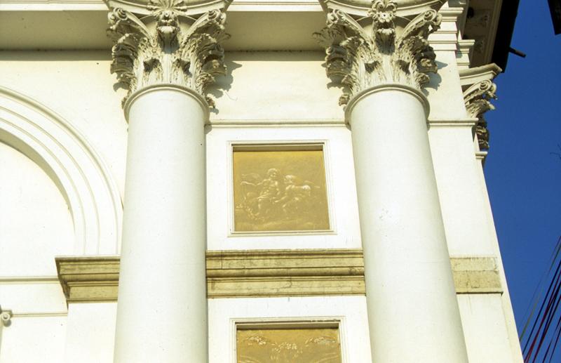 Sulla facciata entro una cornice rettangolare un affresco in chiaroscuro raffigurante due angeli che sorreggono una ghirlanda.
