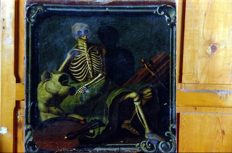 La morte e' qui raffigurata su uno sfondo nero con un panno verde sulle ginocchia, tra oggetti che alludono alle arti scultoree e pittoriche come un busto, una colonna, una tavolozza con dei pennelli.