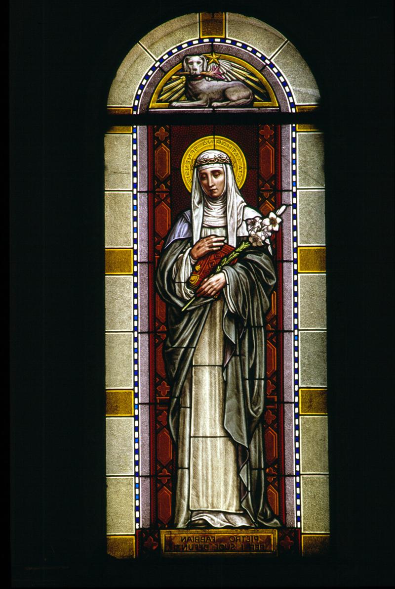 Su uno sfondo rosso bordato con un motivo geometrico e' raffigurata Santa Caterina da Siena in lunga veste bianca, manto grigio e velo sul capo cinto da una corona di spine. La Santa tiene tra le mani un libro chiuso e il giglio bianco; sull'aureola dorata compare il suo nome. Sopra e' rappresentato su uno sfondo di raggi dorati il cane col bastone fiammato in bocca. Sul bordo inferiore compare il nome del donatore. Tutt'intorno vetri rettangolari bianco, avorio e ocra.