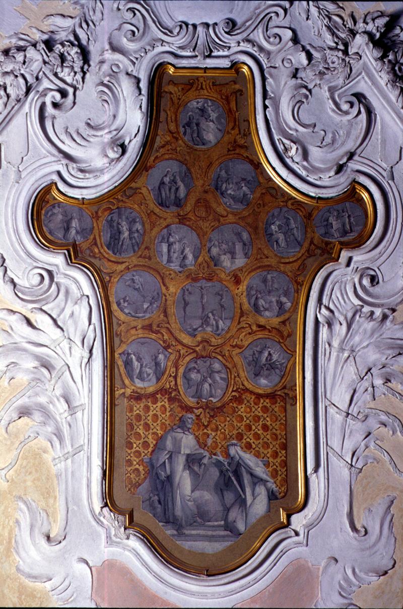 Dipinto a forma di croce con fondo e raffigurante le scene dei misteri del Rosario distribuite in 15 tondi.. Personaggi: San Domenico; Santa Chiara