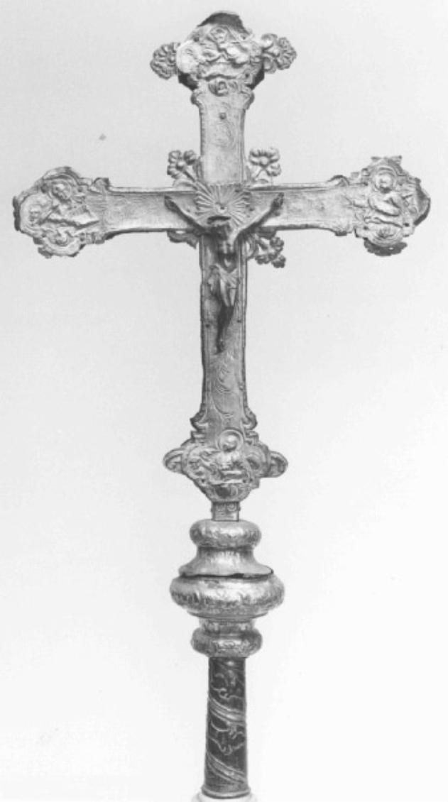 Cristo e Madonna a fusione modellati; santi sbalzati; decorazione fitomorfa incisa