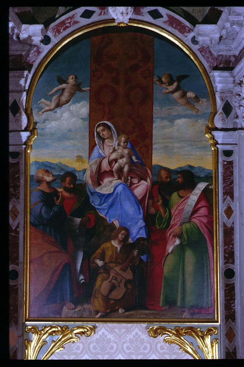 Tela di forma centinata.. Personaggi: Madonna; Gesu' Bambino. Figure: santi; angelo musico; angeli. Paesaggi