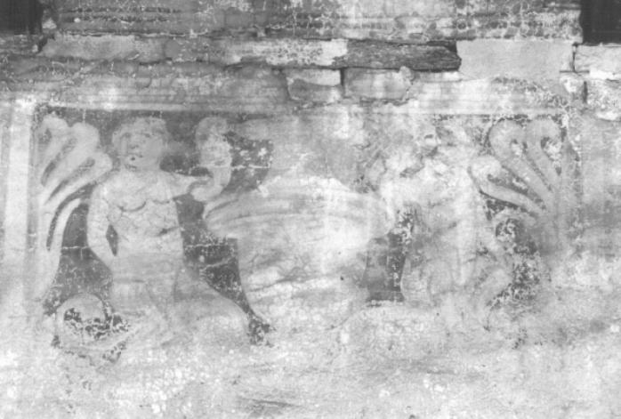 motivi decorativi vegetali con figure e vaso entro finta architettura