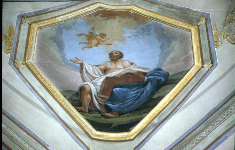 Entro una cornice ad ottagono irregolare, di stucco dipinto di giallo dorato e' raffigurato il Profeta Isaia seduto su un occasionale sedile di roccia grigio scuro indossante una veste bianca che gli lascia nude le spalle e un manto blu; la mano destra regge un grande libro mentre la mano sinistra e' alzata; sullo sfondo il cielo azzurro e nubi entro cui si libra un angelo che accarezza i raggi dorati che scendono dall'alto ad "illuminare" il profeta.