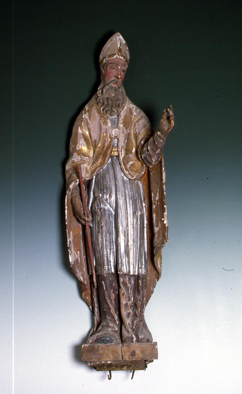 Scultura probabilmente parte di un'ancona lignea tant'è' che posteriormente risulta non finita ma piatta. Il vescovo e' rivestito di abiti pontificali con gesto benedicente e pastorale [?] nella mano destra.