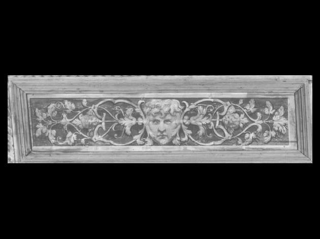 Decorazioni: mascherone; testine di putto; tralci vegetali