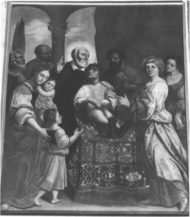 Tenda rossa a sfondo; Santo in nero. Figura femminile a destra in ve- ste bianca e rosa. A sinistra donna con bimbo in veste rossa e bianca. Bimba in veste giallastra.