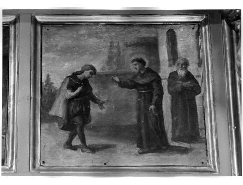 Al centro è Sant'Antonio da Padova, in abito monacale, accompagnato da un confratello, che converte l'animo di un avaro.. Personaggi: Sant'Antonio da Padova. Figure: frate; figura maschile. Abbigliamento. Costruzioni. Piante