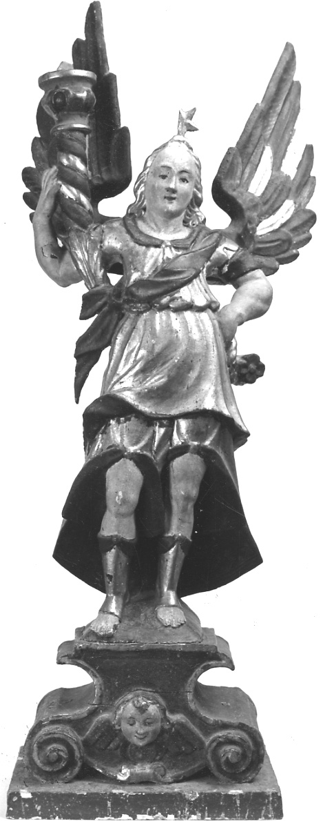 Angelo di legno con reggitorcia che passa dietro la schiena e sbuca sotto il braccio destro; ampie ali e veste drappeggiata, sollevata e fermata sulle ginocchia da due spille ovali. Poggia su basamento rettangolare, con cherubino decorativo sul fronte.. Figure: angelo reggitorcia. Abbigliamento