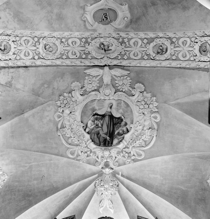 Medaglione con Santa Marta rappresentata a figura intera. Con il mantello protegge alcuni confratelli. Indossa una veste rossa e manto azzurro. Sottarco decorato con medaglioni e angioletti.. Soggetti sacri. Personaggi: Santa Marta. Abbigliamento religioso. Ecclesiastici: frati; monache. Paesaggi