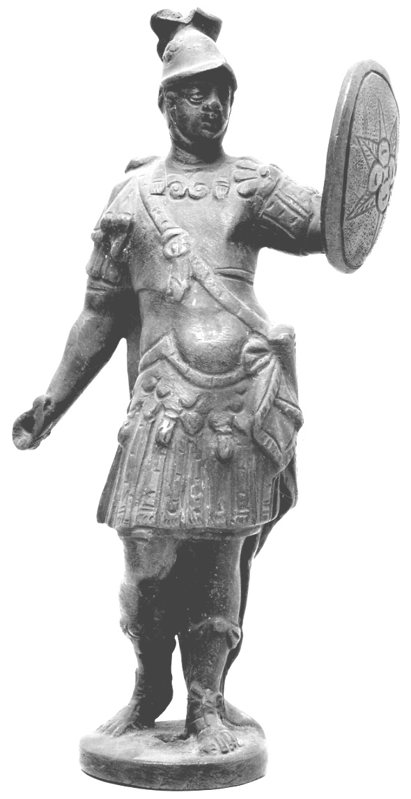 La statuetta era montata su un alare da camino.. Soggetti profani. Divinità: Marte. Abbigliamento. Oggetti: scudo