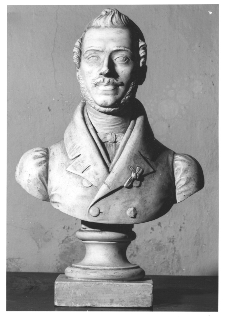Ritratto a mezzobusto di figura virile, vestita con giacca a doppio petto, abbottonata con quattro bottoni circolari. Base di sostegno a sezione circolare.. Soggetti profani. Ritratti: ritratti virili. Personaggi: personaggio virile non identificato. Abbigliamento