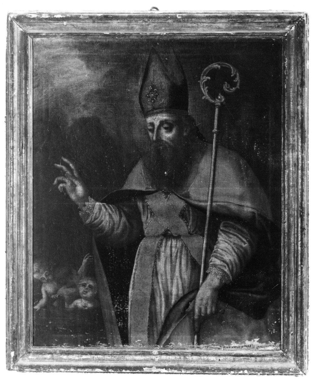 Il dipinto raffigura un Santo Vescovo mentre benedice alcuni bambini, che s'intravedono nella penombra.. Personaggi: Santo Vescovo. Attributi: (Santo Vescovo) mitra; pastorale. Figure: bambini. Vesti ecclesiastiche. Abbigliamento