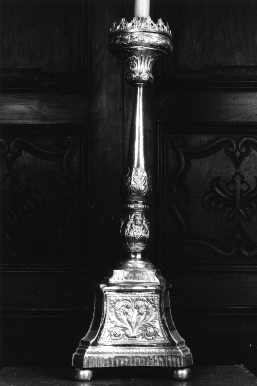 Il candeliere ha tre piedini di appoggio, la base a sezione triangolare, il fusto con nodo a vaso. Le decorazioni sono a strigilature sul bordo della base, a girali sulle facce della base, a cherubini nel nodo, a foglie d'acanto nel bocciolo, a elementi a incastro nel piattello.