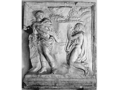 Entro formella rettangolare, profilata da triplice modanatura, Abele, implora il fratello a mani giunte. Dietro, sopra altare a parallelepipedo, due braceri ardenti.. Soggetti sacri: Antico Testamento. Personaggi: Caino; Abele. Simboli: (Dio) mano. Abbigliamento. Oggetti: altare. Fenomeni naturali: fuoco