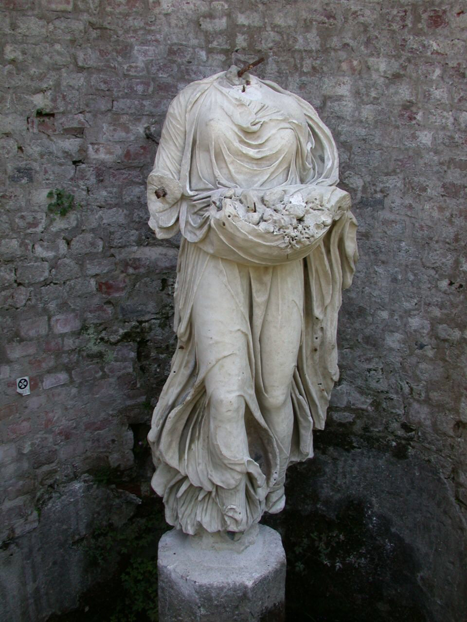 Statua di figura femminile in piedi con ampia veste pieghettata e cesto di fiori e frutti in mano.. Divinità: Flora (o Pomona?). Abbigliamento: veste. Oggetti: cesto. Vegetali: frutta; fiori