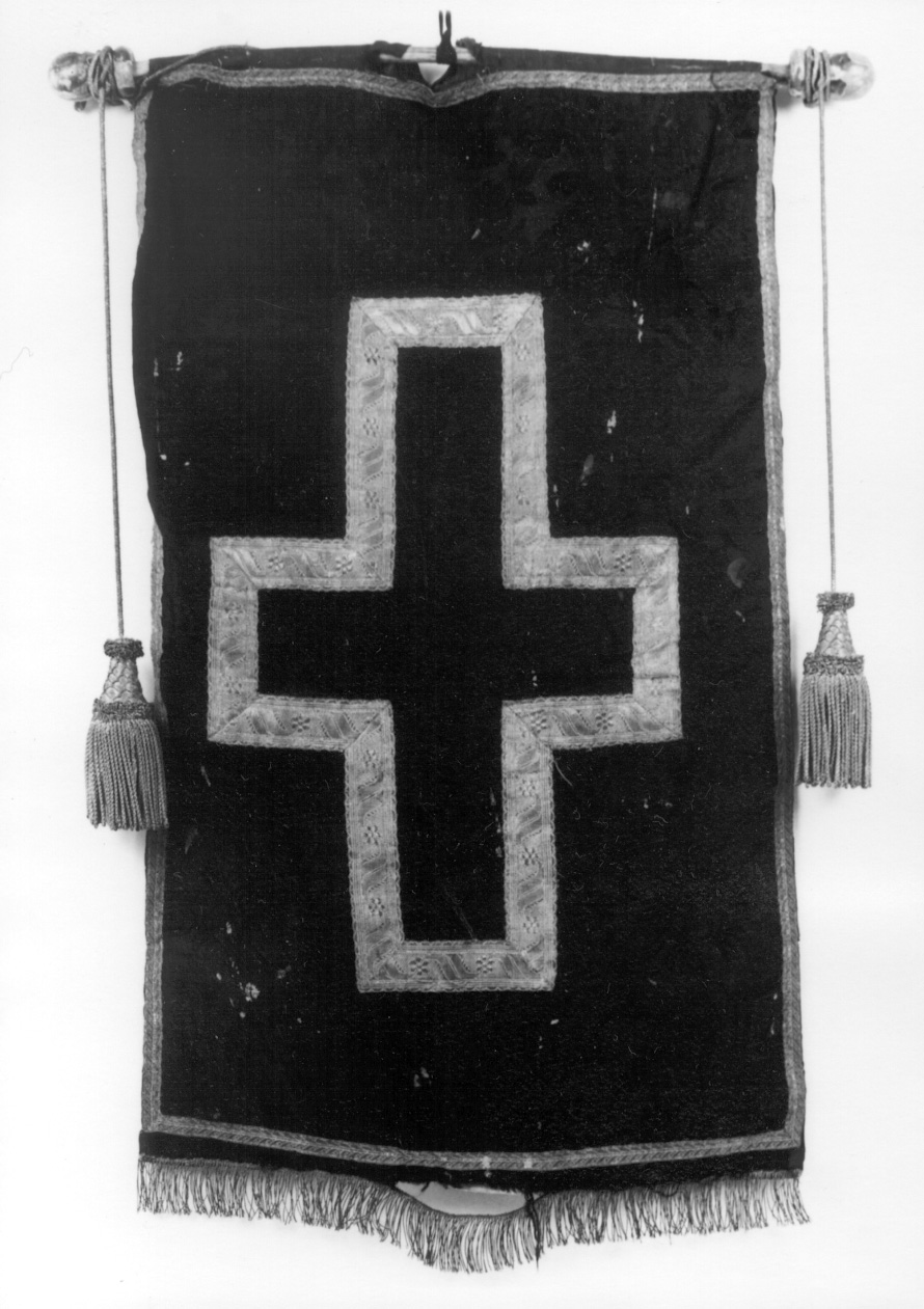 stendardo rettangolare a fondo nero, con croce e profilature argentate; frangia argentata all'estremità inferiore e nappe frangiate appese alle estremità del bastone
