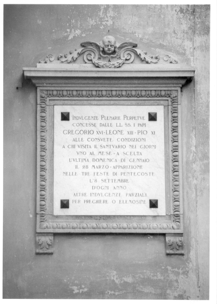 Lapide marmorea quadrata fissata alla facciata tramite quattro punti ricoperti da borchie metalliche a forma piramidale su base quadrata.