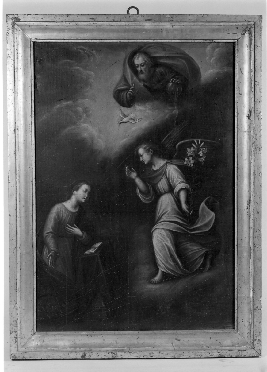 Cornice rettangolare in legno dorato. Madonna con veste rossa e manto nero; angelo annunciante con sottoveste bianca, veste ocra e manto verde. Dio Padre mantello rosso porpora e veste grigia.. Soggetti sacri. Personaggi: San Gabriele Arcangelo; Madonna Annunciata; Dio Padre. Simboli: (Spirito Santo) colomba. Attributi: (Madonna Annunciata) giglio. Oggetti: libro. Fenomeni metereologici: nuvole. Fenomeni divini: luce soprannaturale. Abbigliamento