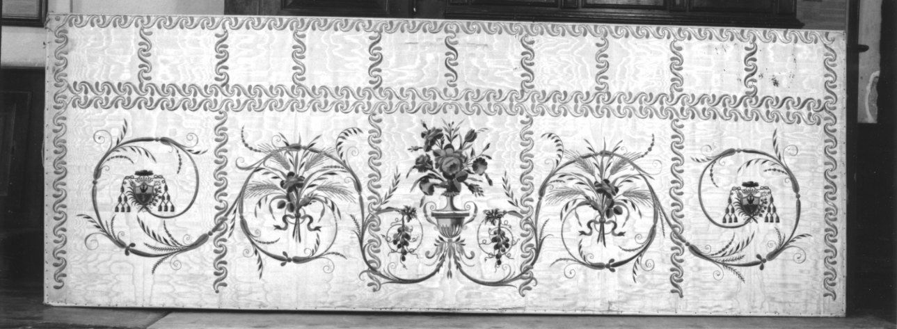 La decorazione presenta un modulo a greca, con segmenti circolari, il quale fa da sfondo ad un ricamo che si trova nella parte inferiore. Esso raffigura due stemmi laterali, circondati da dei gambi dai quali si dipartone delle foglie; verso la parte centrale si trova un fiore con foglie e spighe ripetuto specularmente, mentre al centro un vaso contiene fiori e foglie.. Araldica: stemma