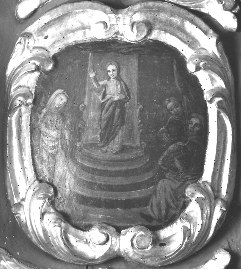 Soggetti sacri. Personaggi: Madonna; Gesù Bambino; San Giuseppe. Figure: dottori del tempio. Interno: gradini; pulpito. Abbigliamento