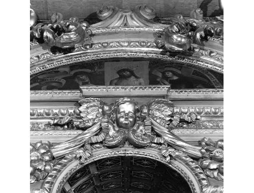 Cristo, al centro della lunetta, è raffigurato in piedi all'interno del sepolcro, davanti ad un lenzuolo damascato; il capo, con la corona di spine, é reclinato a sinistra di chi guarda, gli occhi sono chiusi, le braccia incrociate alla vita e le ferite sanguinanti. Sulla sinistra, la Vergine reclina il capo coperto dal manto blu scuro, porta la mano sinistra al petto e solleva il braccio destro. Dall'altro lato S. Giovanni, di tre quarti, volge lo sguardo a Cristo e ha le mani giunte; dalla spalla destra scebde il mantello rosso dai bordi dorati.. Soggetti sacri. Personaggi: Cristo; Madonna; San Giovanni Evangelista. Simboli della passione: corona di spine; lenzuolo