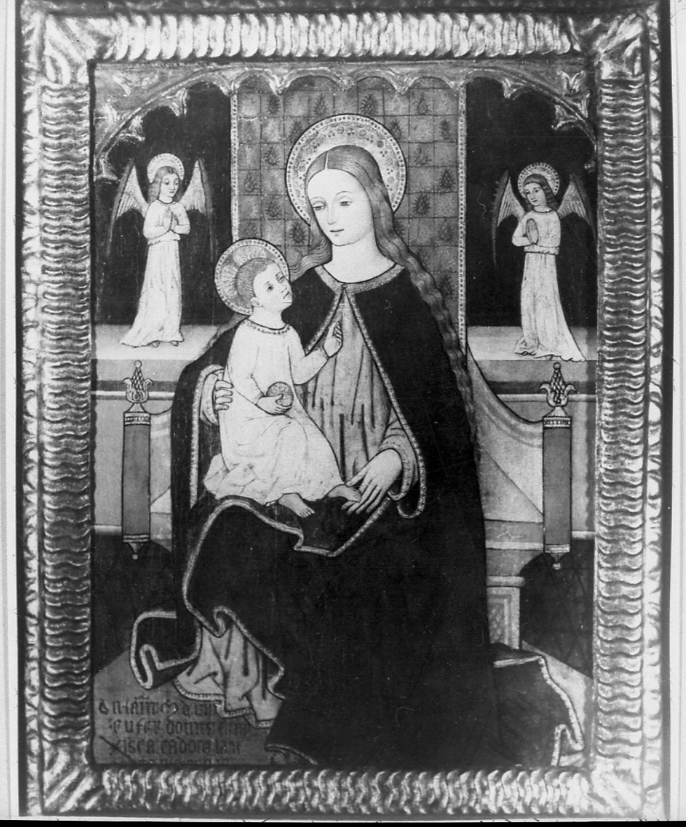 La cornice dorata antica, ad arco ribassato, a festoni, appare nella parte superiore della tavola, oggi inserita in una cornice lignea intagliata a scaglie parallele, che sembra coprire a metà l'ultima riga della scritta dedicatoria sulla predella del trono, in basso a sinistra. La Madonna ha lunghi capelli ondulati, dialoga con il Bambino seduto sulle ginocchia, tenendogli delicatamente un piede con la sinistra. Lungo manto agganciato appena sotto il collo, grandi pieghe spezzate ripiegate sulla predella. Alle spalle una tenda tesa, dietro il trono una balaustra su cui stanno, in piedi, due angeli a mani giunte e ali aperte.. Soggetti sacri. Personaggi: Madonna; Gesù Bambino; angeli
