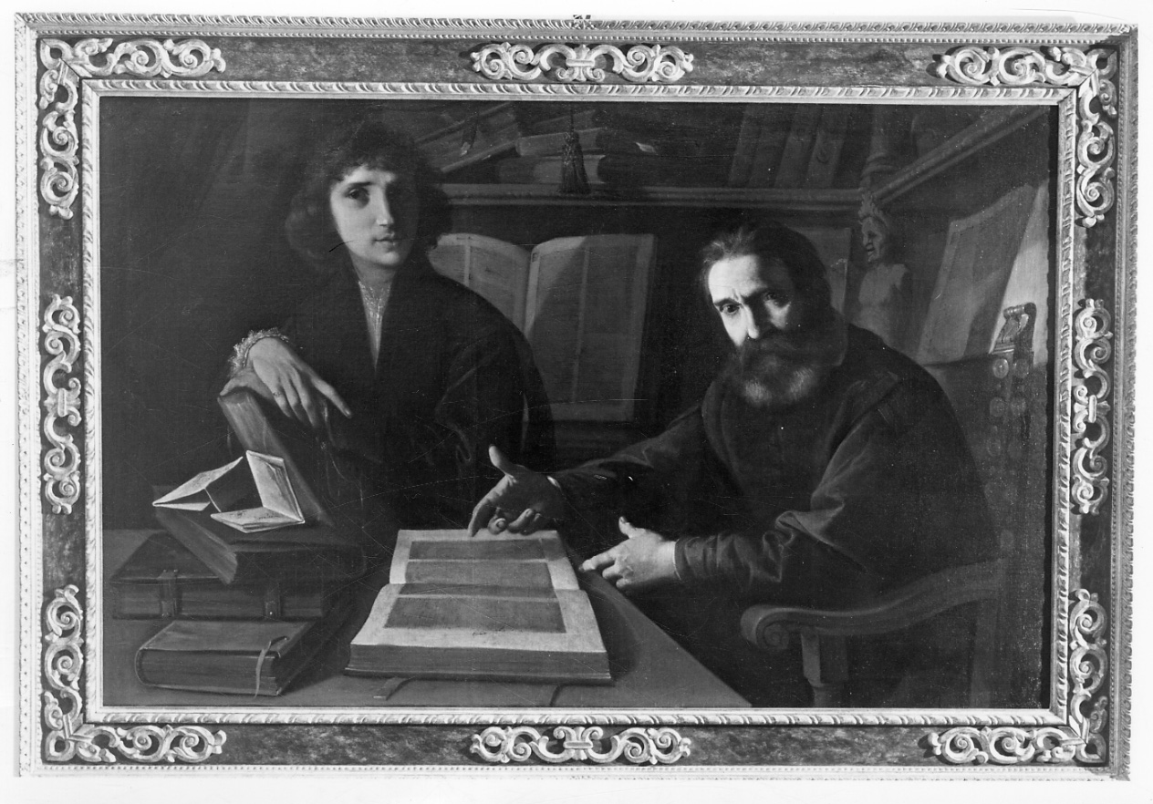 La scena si svolge in un interno tenuamente illuminato. Sullo sfondo: una libreria, sui cui scaffali sono accatastati libri chiusi e aperti, e su cui è appoggiata un'erma. In primo piano, intorno a un tavolo sono seduti una figura maschile matura e barbuta (sulla sinistra di chi guarda), e un giovane uomo (a destra). Il vecchio è seduto su una sedia in legno massiccio riccamente decorato. Sulla tavola, ancora libri chiusi e libri aperti. Il giovane si appoggia sulla pila di libri che ha di fronte. Su questa pila di libri, vi sono due fogli ripiegati: su uno di essi si legge la firma del pittore. Entrambe le figure guardano verso lo spettatore e indicano un grosso libro aperto posto davanti al vecchio barbuto.. Soggetti profani. Ritratti. Figure maschili. Allegorie-simboli. Interno: studio. Mobilia: scaffali; sedia. Oggetti: libri