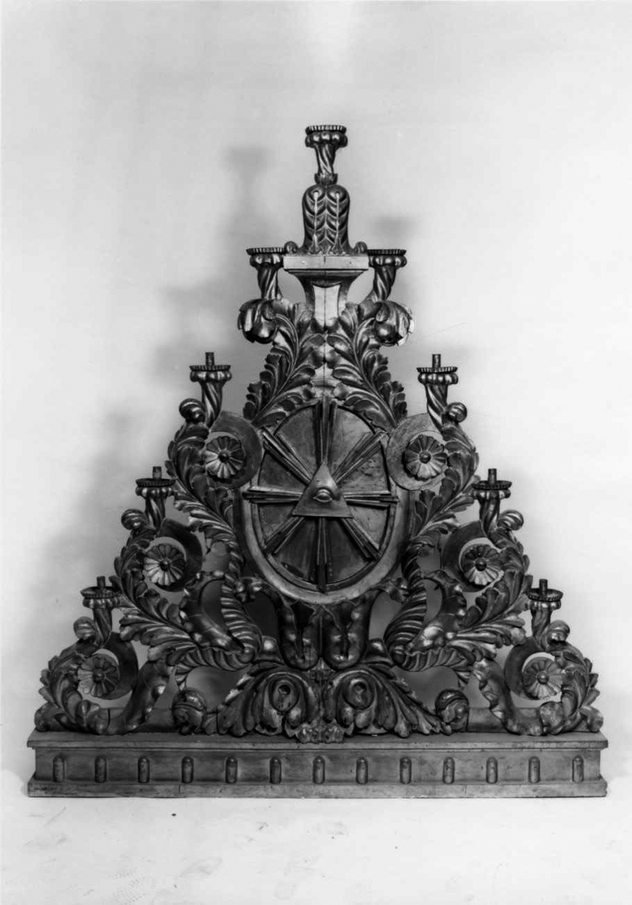 Base rettangolare modanata e dentellata. Nove luci salgono a piramide da robusto e tortuoso sviluppo di foglie d'acanto. Al centro ovale con triangolo raggiato, simbolo della Santissima Trinità.. Simboli: triangolo includente l'occhio divino