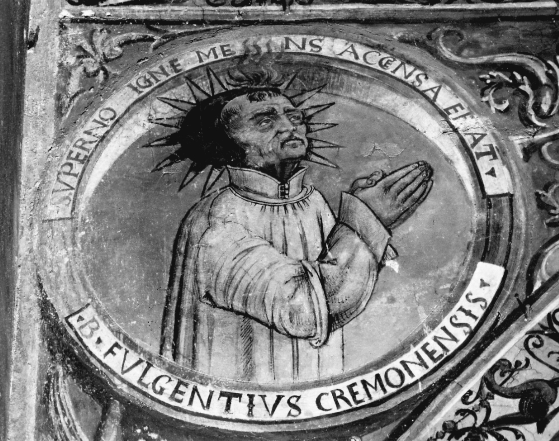 Il beato Fulgenzio da Cremona è ritratto a mezza figura, volto di tre quarti verso destra. La figura è ritratta a mani giunte, in segno di preghiera.. Soggetti sacri. Beati: Fulgenzio da Cremona. Abbigliamento