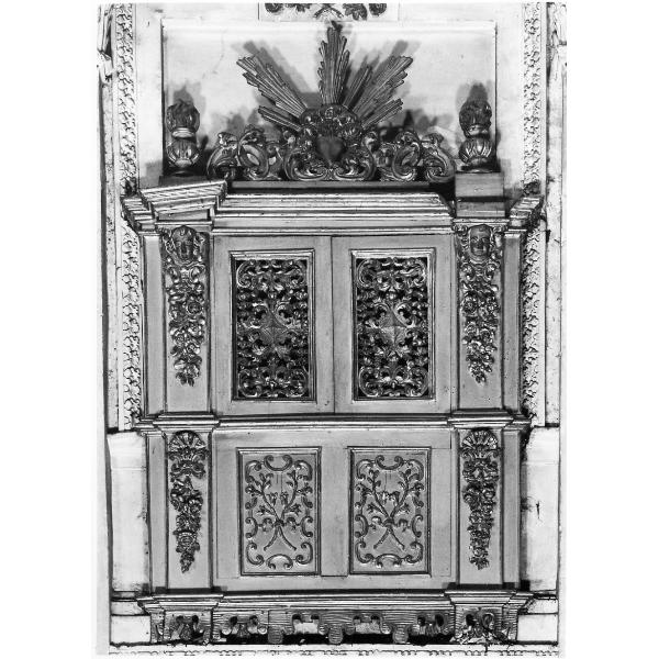 I matronei sono collocati nella navata centrale. Nella parte inferiore, sopra a una frangia di legno, i due pannelli sono decorati con motivi vegetali a rilievo dorato, contornati da un bordo. Ai lati due dense cadute di frutta e fiori sgorgano da una conchiglia. Il motivo si ripete anche nella zona superiore, ma nasce dal volto di un angelo. I pannelli sono traforati e presentano al centro una losanga da cui si diparte la fitta decorazione vegetale. Termina con un cuore raggiante e con due lampade.