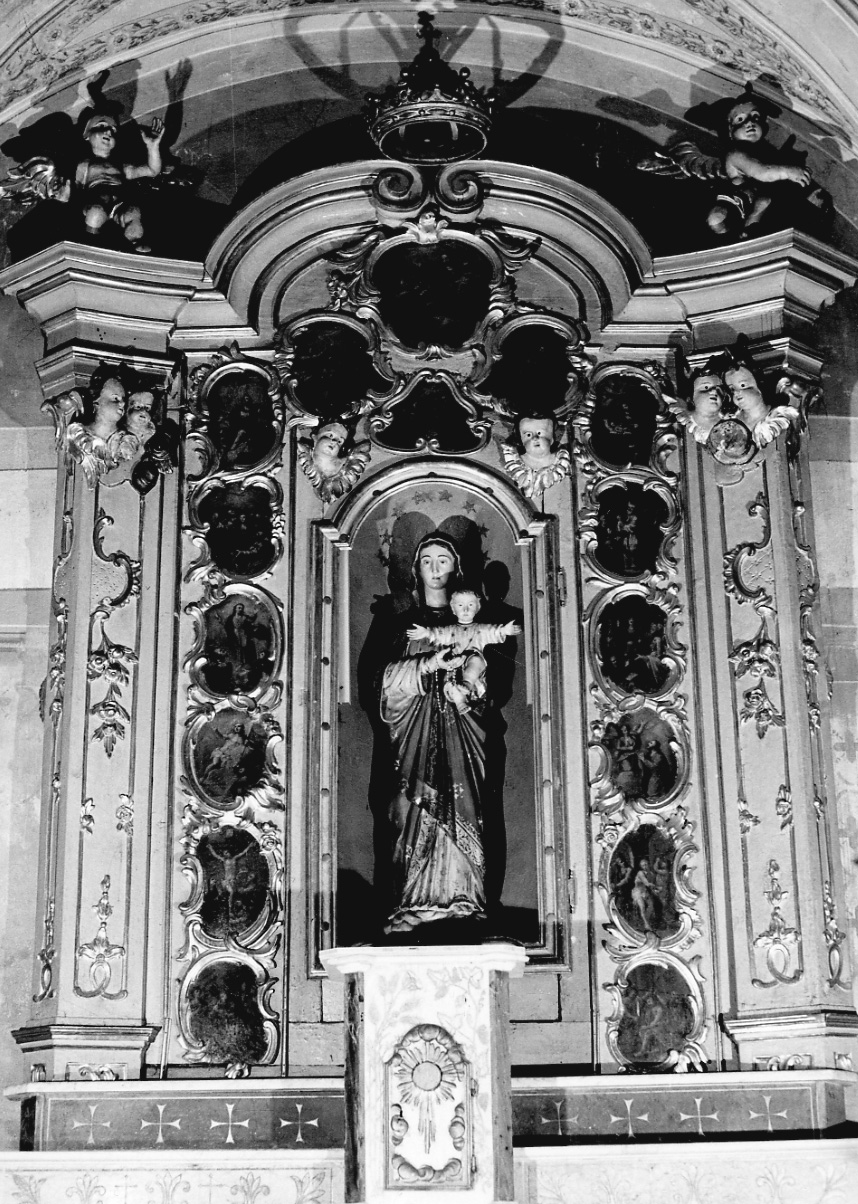 Tipologia architettonica; ai lati due corpi aggettanti presentano una decorazione a rilievo in oro, con sottili motivi lineari e vegetali su fondo chiaro, in corrispondenza delle specchiature rettangolari. In corrispondenza della parte superiore, costituita da una cornice modinata, sono scolpite a tutto tondo coppie di teste cherubiche dipinte a vivaci colori. La parte centrale della mostra, dotata di nicchia entro la quale è collocata una statua della Madonna del Rosario, è ornata da 15 cornici mistilinee decorate da sinuosi motivi vegetali in oro che contengono la rappresentazione, ad olio su tavola, dei Misteri del Rosario e, in una cartella posta superiormente, della Madonna con il Bambino che dona il rosario a san Domenico. Cornice modinata formata da elementi a voluta affrontati, sormontati da corona chiusa con croce latina apicale interamente dorata. Al di sopra dei corpi laterali sono scolpiti a tutto tondo due angeli in volo che rivolgono lo sguardo, rispettivamente, quello di destra verso l'alto e, quello di destra, verso i fedeli.. Soggetti sacri. Personaggi: Maria Vergine; Gesù Cristo. Figure: uomini; sacerdoti; donne; angeli. Abbigliamento